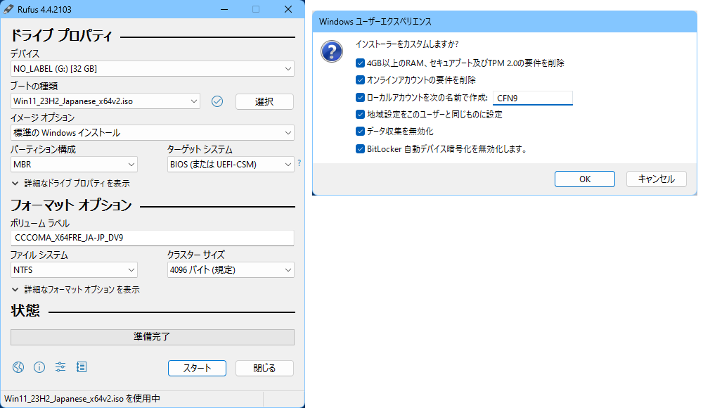 Rufusのパーティション構成はMBRで、ユーザーエクスペリエンスは深く考えないで全てチェックしてUSBメモリを作成した。